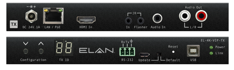 The ELAN Premium Video over IP (VIP) platform enables distribution of HDMI video over a 1Gb Network switch. The EL-4K-VIP-TX and EL-4K-VIP-RX are HDCP 2.2 compliant Transmitters and Receivers that use visually lossless compression technology to deliver HDMI, Bi-directional IR, RS-232 and USB/KVM up to lengths of 100m over standard network architecture. The EL-4K-VIP-TX/RX can be powered via PoE from a Network switch or powered locally should a switch either not be used or not support PoE. With multiple configuration options available, this Video over IP solution is ideal for both commercial and residential installations."