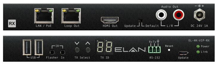 The ELAN Premium Video over IP (VIP) platform enables distribution of HDMI video over a 1Gb Network switch. The EL-4K-VIP-TX and EL-4K-VIP-RX are HDCP 2.2 compliant Transmitters and Receivers that use visually lossless compression technology to deliver HDMI, Bi-directional IR, RS-232 and USB/KVM up to lengths of 100m over standard network architecture. The EL-4K-VIP-TX/RX can be powered via PoE from a Network switch or powered locally should a switch either not be used or not support PoE. With multiple configuration options available, this Video over IP solution is ideal for both commercial and residential installations.