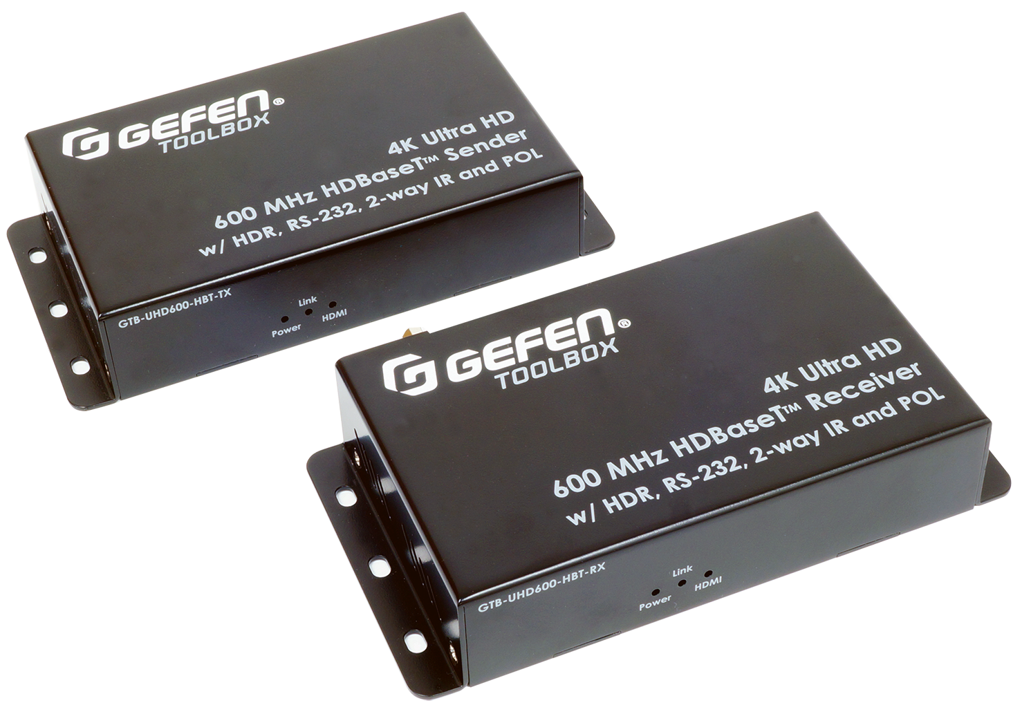 This extender uses HDBaseT™ technology along with Gefen’s visually lossless proprietary compression algorithms with very high PSNR (Peak Signal to Noise Ratio), to accommodate resolutions up to 4K Cinema-DCI (4096 x 2160 to 60 Hz 4:4:4) and 4K Ultra HD (3860 x 2160 to 60 Hz, 4:4:4) with HDR. High Dynamic Range (HDR) delivers greater contrast between light and dark areas of a video image, resulting in tremendous improvement in picture quality and color depth. HDCP 2.2 and the legacy HDCP 1.4 are both supported. The GTB-UHD600-HBT also supports 1080p Full HD, WUXGA (1920 x 1200), 3DTV, and Deep Color (up to 1080p resolution). Highest performance multichannel digital audio including 7.1 channels of LPCM and HBR (High Bit Rate) digital audio formats, such as Dolby Atmos®, Dolby® TrueHD, DTS:X™, and DTS-HD Master Audio™ are passed through to the HDMI outputs. The GTB-UHD600-HBT provides RS-232 and 2-way IR extension between the Sender and the Receiver units, facilitating the control of A/V sources placed near the Sender unit and sending automation commands to the display or another device placed near the Receiver unit. Gefen’s Bi-Directional POL (Power Over Line) technology powers the Sender or the Receiver unit using the same cable that extends the HDMI signal. Only one of the two units will need a power supply. This feature simplifies installation in cases when an electrical outlet may not be available near the source or the display. Small, low profile enclosures can be securely surface-mounted and conveniently hidden away from sight, and accommodate Gefen locking HDMI cables for secure connections.