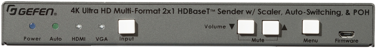 Switching between the HDMI and VGA can be set to automatic or be done manually via the front panel button or RS-232. Its HDMI input supports 18 Gbps of data and 600 MHz TMDS Clock frequency, accepting full spec HDMI 2.0 to 4K Ultra HD (3860 x 2160) and 4K Cinema-DCI (4096 x 2160), at 60 Hz 4:4:4 with HDCP 2.2 and 1.4. The HDBaseT extension system supports 10.2 Gbps of data throughput and 300 MHz TMDS Clock frequency, and resolution/timing up to 4K 30 Hz 4:4:4. It uses Gefen’s implementation of the HDBaseT technology with enhancements including Advanced EDID Management. Highest performance multichannel digital audio including 7.1 channels of LPCM and HBR (High Bit Rate) digital audio formats, such as Dolby Atmos®, Dolby® TrueHD, DTS:X, and DTS-HD Master Audio are passed through from the HDMI input to output. The VGA input features a companion L/R analog audio input, and accepts VESA and CEA resolutions up to WUXGA (1920 x 1200 to 60 Hz, 4:4:4) and 1080p Full HD (1920 x 1080 at 60 Hz, 4:4:4).