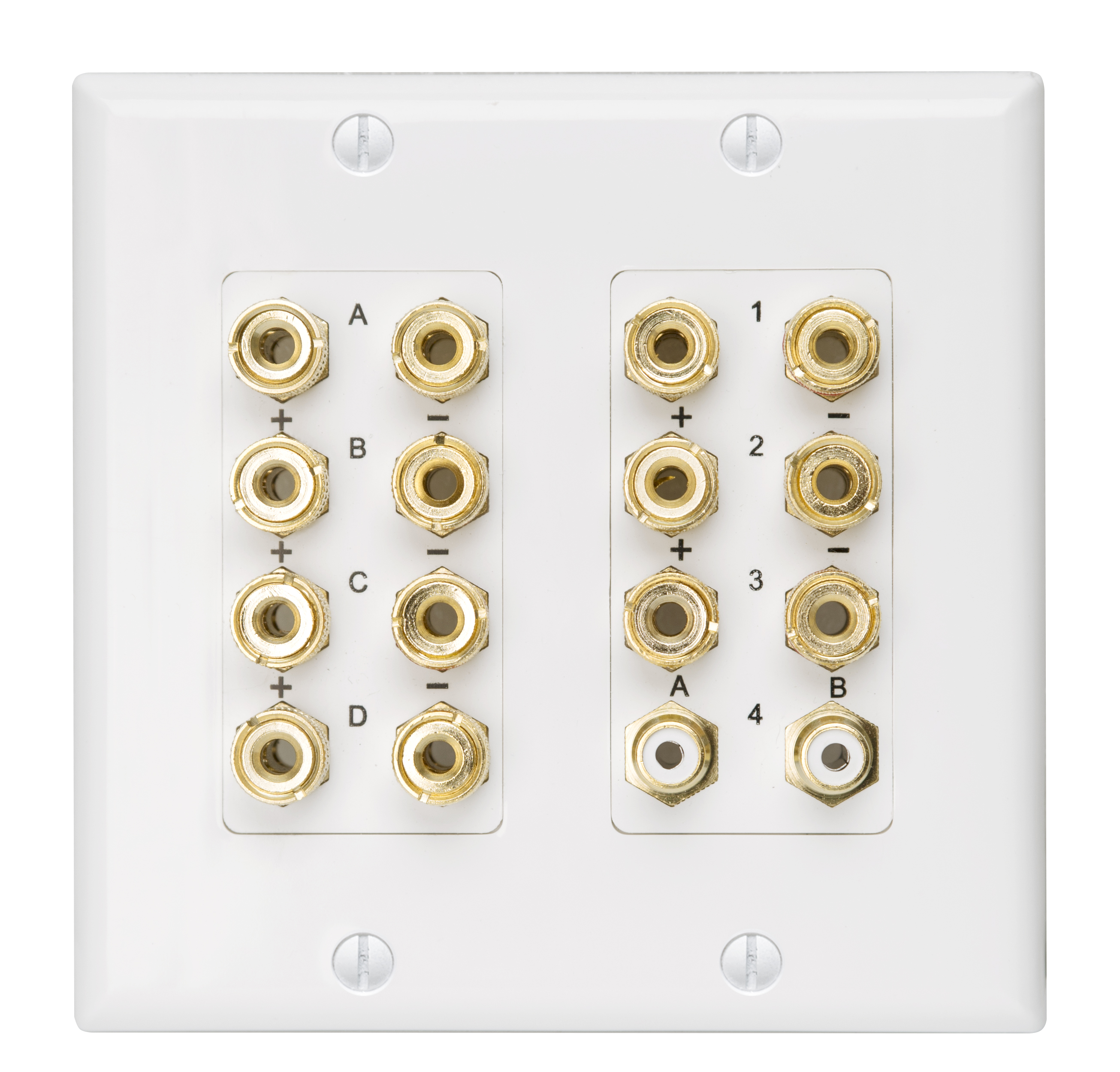 It includes terminals for up to seven speakers and two powered subwoofers. Its Decora design allows for each half to be used independently if desired, for two single-gang plates, one with 4 pairs of stereo binding posts and one with 3 pairs and a pair of RCA jacks. Flexible to be used in multiple configurations, each connection is clearly labeled. The gold-plated binding posts and RCA connectors make for easy and secure connections, and the captured posts won’t turn while they are being tightened. The 5-way binding posts can accept the following: bare or tinned wire up to 12 gauge in thickness, pins, spade lugs, and single or double banana plugs. The powered subwoofer connections use high quality gold-plated RCA connectors.